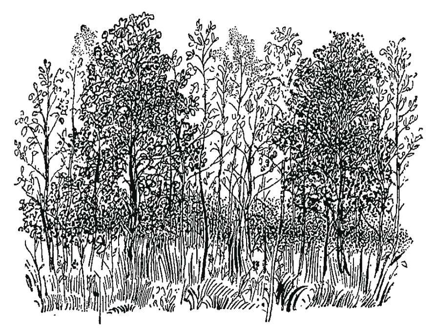 毛茸茸的灰绿色小松树,在很远处就能引起人的注意。身处它们中间是一件多么快乐的事情啊!一切都那么生机盎然:柔软的绿色苔藓、叶子闪闪发亮的越橘林,还有石南,优雅的石南的细枝上,覆盖着小得出奇的叶子,像瓦片似的,枝上还保留着去年的淡紫色小花。