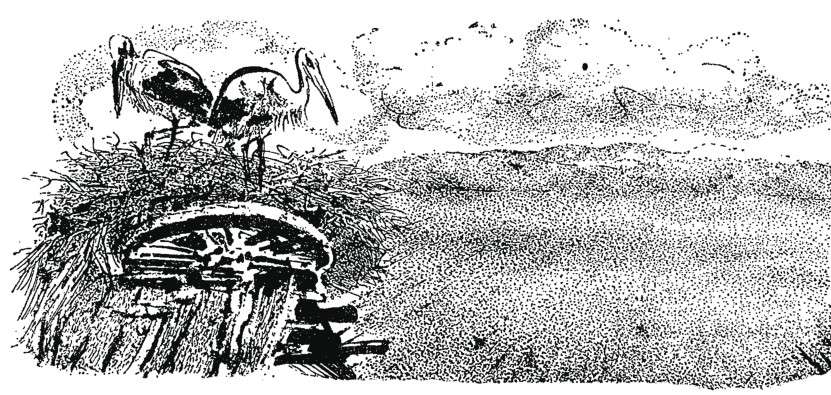 现在白鹳在车轮上摆上粗粗细细的树枝,开始筑巢了。