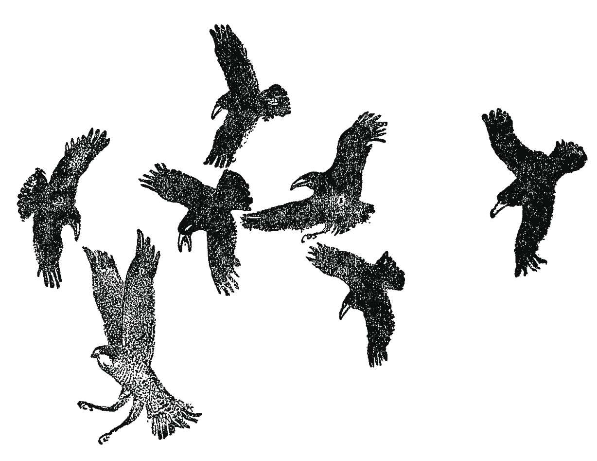 我站在高山上,能看得很远。我看见鹞落在树上平复情绪,突然不知从什么地方有一大群白嘴鸦咆哮着向它飞扑过来。这下鹞的处境非常危险。它愤怒地尖叫着向一只白嘴鸦飞扑过去。那只白嘴鸦害怕了,闪到一边。于是鹞非常敏捷地飞向高空,没什么能阻碍它。失去了俘虏的白嘴鸦只好向田野各处飞散开去。