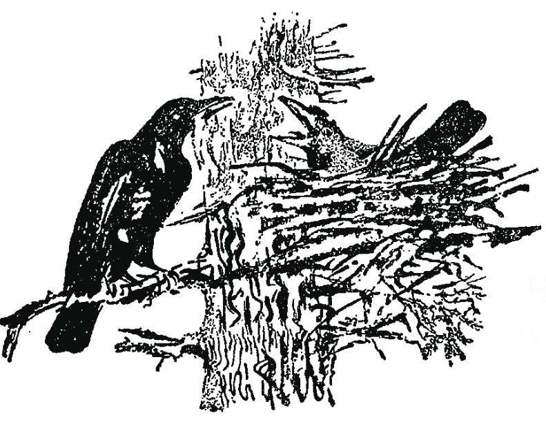 鸟类中第一个下蛋的是母乌鸦。它的窝建在高高的云杉上,覆盖着厚厚的白雪。为了使鸟蛋不被冻坏、鸟蛋里的小鸟不被冻死,母乌鸦是不会离开鸟巢的。公乌鸦带来食物给它。