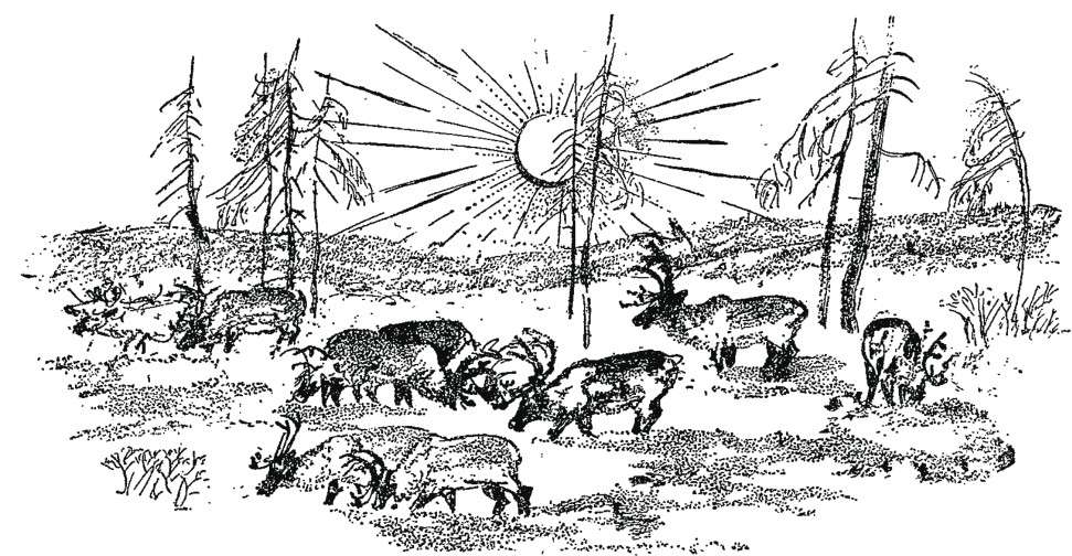 北方的一群群鹿用蹄子扒开雪,敲碎冰,找苔藓给自己吃。