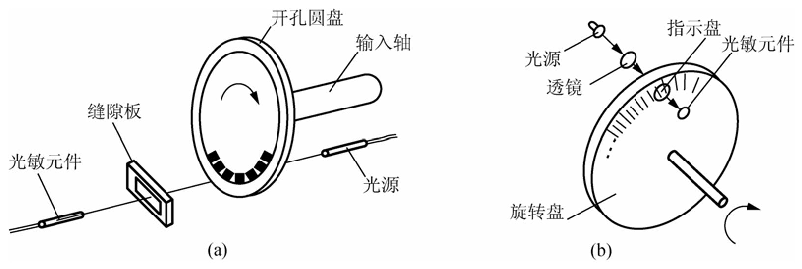 这种结构的传感器由于开孔盘尺寸的限制,其开孔数目不可能太多,使应用受到限制。为了增加圆盘的开孔数目,目前多采用图2.28(b)所示的结构。图中指示盘与旋转盘具有相同间距的缝隙,当旋转盘转动时,每转过一条缝隙,光线便产生一次明暗变化,使光敏元件感光一次。用这种结构可以大大增加了转盘上的缝隙数,使每转的脉冲数相应增加。