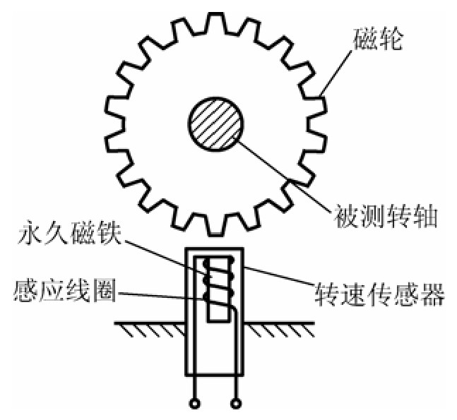 磁电式转速传感器的结构,如图2.27所示:它由永久磁铁、感应线圈、磁轮等组成。在磁轮上有齿形凸起,磁轮装在被测转轴上,与转轴一起旋转。当转轴旋转时,磁轮的凸凹齿形将引起磁轮与永久磁铁间气隙大小的变化,从而使永久磁铁组成的磁路中磁通量随之发生变化。磁路通过感应线圈,当磁通量发生突变时,感应线圈会感应出一定幅度的脉冲电势,其频率为
