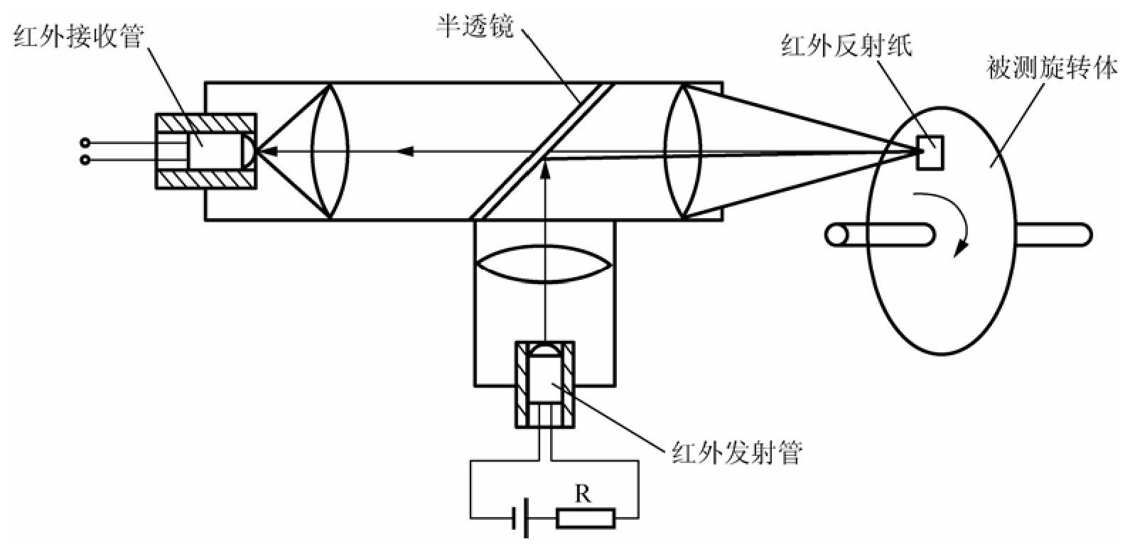 反射式光电转速传感器结构如图2.29所示。它由红外发射管、红外接收管、光学系统等组成;光学系统由透镜及半透镜构成。红外发射管由直流电源供电,工作电流为20mA,可发射出红外光。半透镜既能使发射的红外光射向转动的物体,又能使从转动物体反射回来的红外光穿过半透镜射向红外接收管。测量转速时需要在被测物体上粘贴一小块红外反射纸,这种纸具有定向反射作用。