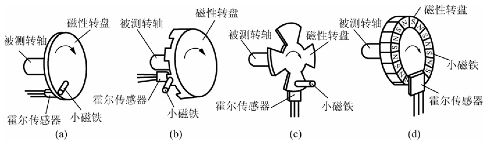 霍尔式传感器是根据霍尔效应制作的一种磁场传感器。霍尔效应是磁电效应的一种,通过霍尔效应实验测定的霍尔系数,能够判断半导体材料的导电类型、载流子浓度及载流子迁移率等重要参数。其广泛地应用于工业自动化技术、检测技术及信息处理等方面。霍尔式转速传感器是由霍尔开关集成传感器和磁性转盘组成,霍尔式转速传感器的各种不同结构如图2.31所示。霍尔式转速传感器广泛应用于转速的监视与测量。将磁性转盘的输入轴与被测转轴相连,当被测转轴转动时,磁性转盘便随之转动,固定在磁性转盘附近的霍尔开关集成传感器便可在每一个小磁铁通过时产生一个相应的脉冲,检测出单位时间的脉冲数,便可知道被测对象的转速。磁性转盘上的小磁铁数目将决定传感器的分辨率。