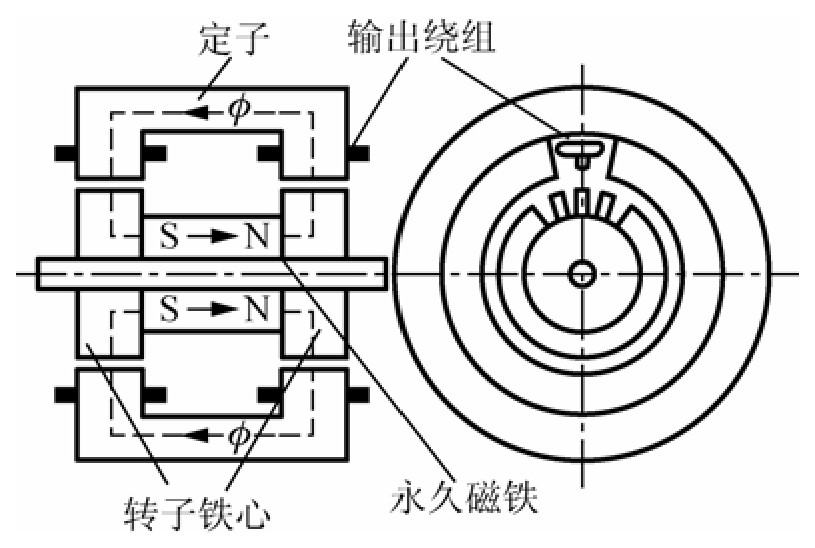当转子不转时,永久磁铁在电动机气隙中产生的磁通不变,所以定子输出绕组中没有感应电动势。当转子以一定速度旋转时,定、转子齿之间的相对位置发生了周期性变化,定子绕组中有交变电动势产生。例如,转子一个齿的中线与定子某一齿的中线位置一致时,该定子齿对应的气隙磁导为最大,当转子转过1/2齿距时,转子槽的中线与定子齿的中线位置一致,该定子齿对应的气隙磁导又为最小,以后的过程重复进行。