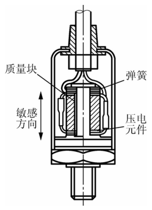 图2.42(a)所示为压缩型振动加速度传感器结构原理。它靠通过中心轴的螺栓连接的质量块,检测微小的加速度。使用时,传感器基体固定在被测物体上,感受该物体的振动,惯性质量块产生惯性,使压电元件产生变形,压电元件产生的变形和由此产生的电荷与加速度成正比。