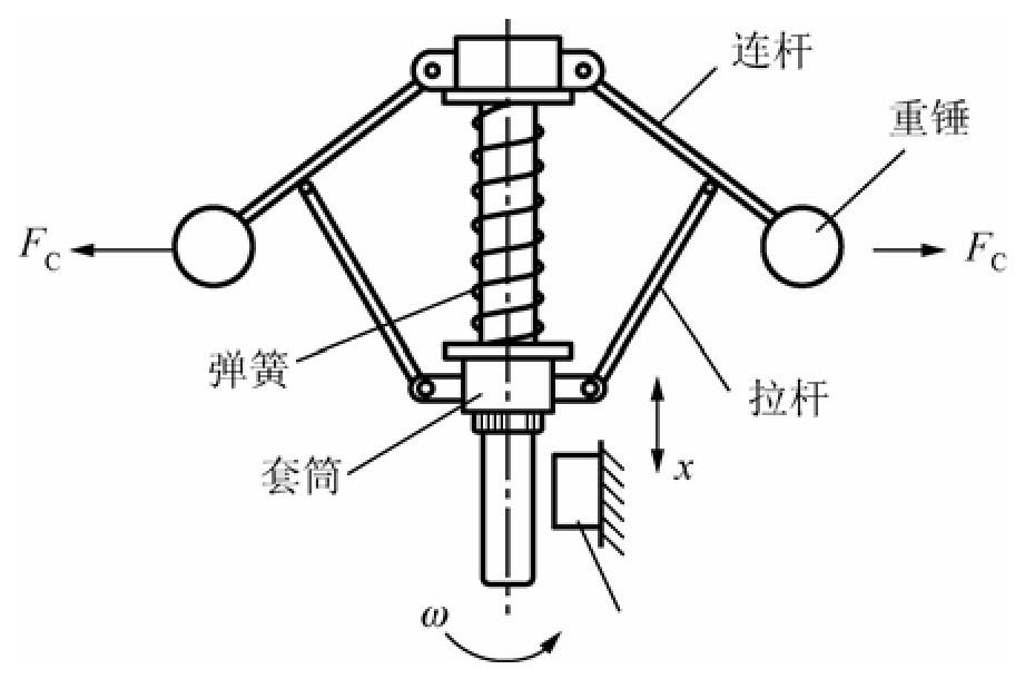 当被测物体转动时,整个离心机构将跟着旋转。重锤在旋转时产生的离心力 F C ,通过连杆及拉杆使套筒沿轴线方向向上运动,套筒向上运动时压缩弹簧,弹簧产生的反弹力使套筒达到动平衡状态,从而使重锤停留在跟转轴成某个夹角的位置上。被测转速越高,重锤产生的离心力越大,套筒的位移量 x 也就越大;通过位移传感器检测出套筒的位移量,就知道了被测速度。离心式转速传感器的最高速度可达2000r/min,精度为1%~2%。