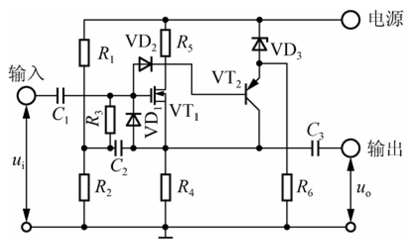 图2.44所示为高输入阻抗电压放大器(阻抗变换器),输入阻抗大于1000MΩ,输出阻抗小于100Ω。第一级采用场效应管构成源极输出器,第二级采用晶体管构成对输入端的负反馈,以提高输入阻抗。也可以采用场效应管作为输入级的运算放大器。但是,当传感器与电压放大器之间的连接电缆发生变化时,由于电缆电容与传感器电容并联,必然引起传感器输出电压灵敏度发生变化,引起误差,解决办法之一就是采用电荷放大器。