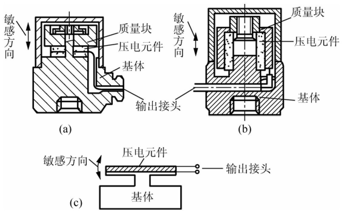 利用压电陶瓷的压电效应可构成不同使用要求的振动加速度传感器,外形如图2.41所示,常用的有图2.42所示的三种原理结构。