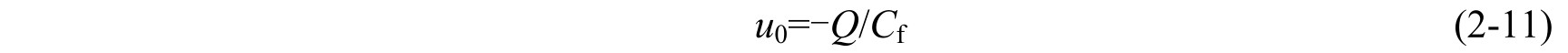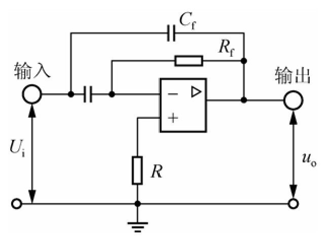 电荷放大器是一个有反馈电容 C f 的高增益运算放大器,电路如图2.45所示。运算放大器的输入阻抗应高达10 12 Ω以上, C f 为反馈电容,一般为千分之几微法, R f 为提供运算放大器直流工作点电阻,其阻值大于10 10 Ω。放大器输出电压 u 0 与输入电荷成正比,即