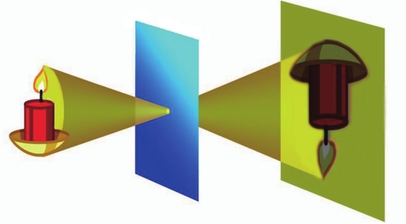 景物反射的光线通过很小的小孔时,会在墙体上成像,比较清晰,但亮度不够。