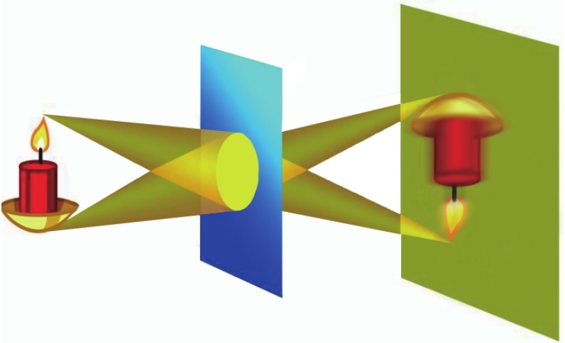 景物发射的光线通过稍大的小孔时,也会在墙体上成像,亮度较高,但清晰度很低,变得非常模糊,如果小孔继续增大,在墙体上所成的像就会变成一团光斑。