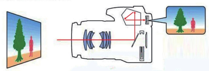 取景时的光线流程:光线通过镜头进入相机,此时的光圈不起作用;光线照射到反光镜会被反射到五棱镜,五棱镜多次反射后将拍摄的画面颠倒过来,成正立的像。如果没有五棱镜,我们从取景器看到的会是颠倒的像。