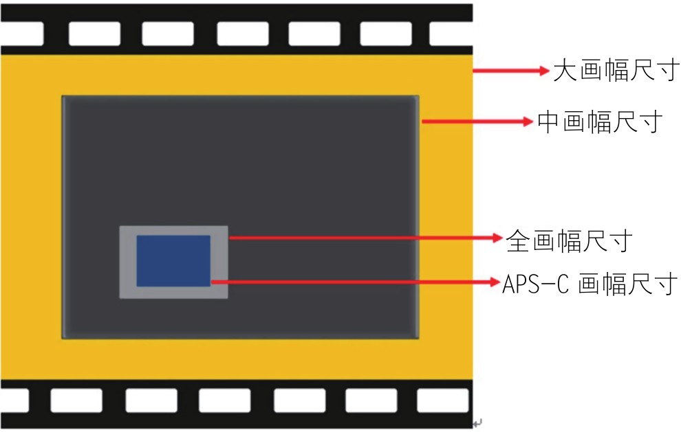 本示意图显示了大画幅、中画幅、全画幅及APS-C画幅形式的感光元件大小比例。