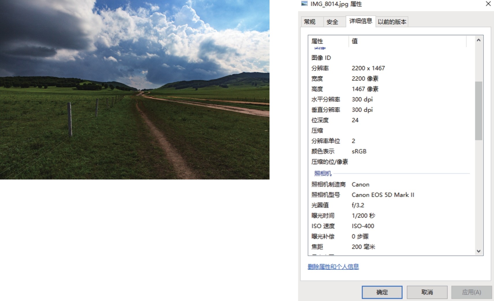 查看这张照片的参数,你会发现其尺寸是5616×3744,乘积约为2103万,基本上正好等于这款相机的有效像素;同时在其属性信息内,你也可以发现其垂直分辨率和水平分辨率两个数值,而将5616×3744标记为分辨率就是错误的,这应该是照片尺寸。
