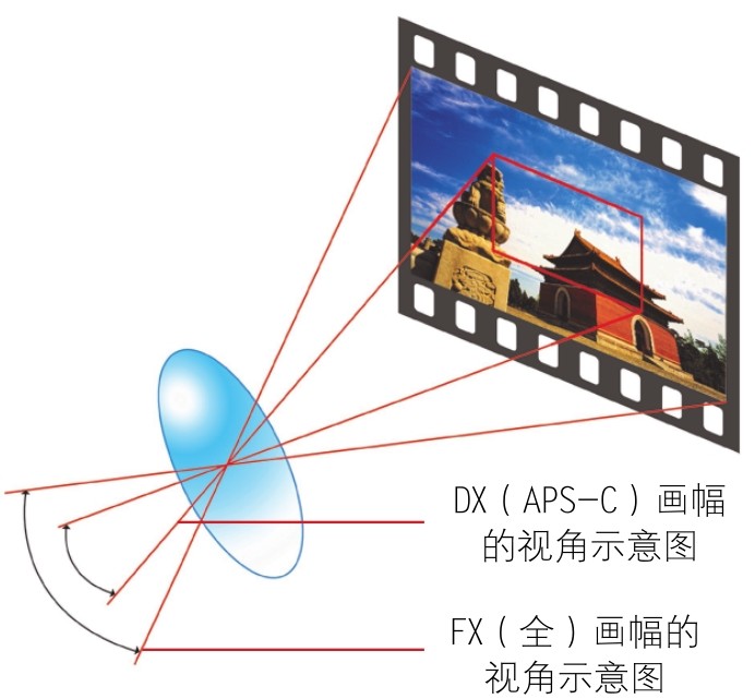 画幅越大,拍照时的视角也越大。图示为全画幅与APS-C画幅的视角比例示意图。