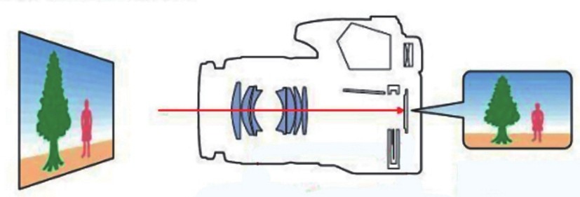 按下快门拍摄时的光线流程:光线通过镜头进入相机,镜头中光圈可以调节光束的粗细;快门按下反光镜升起不再阻挡光线,光线长驱直入,照射到感光元件上;感光元件感光激发电子,电子经过电路处理后成像显示到液晶屏上;同时存储到存储卡。