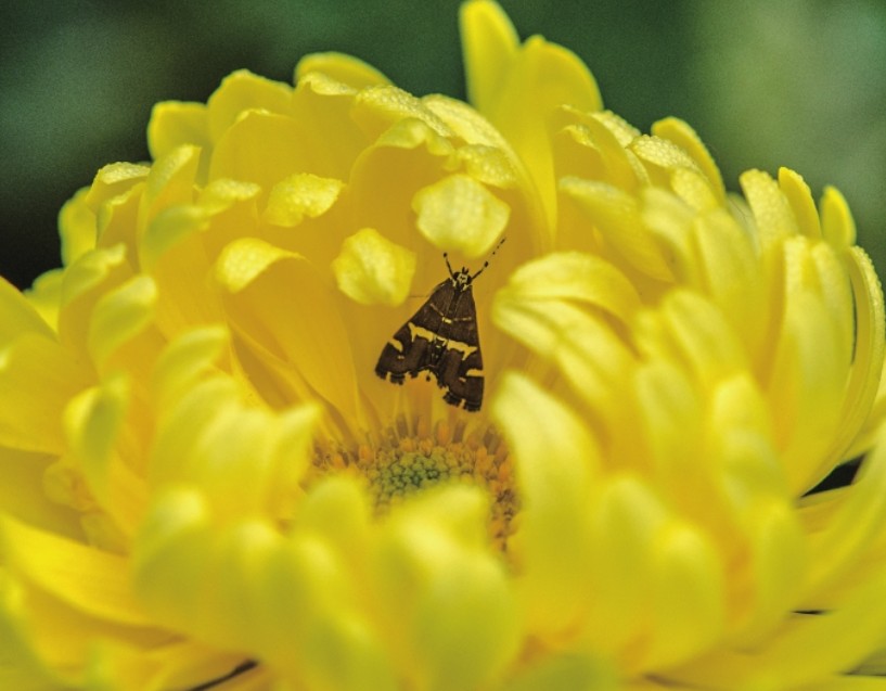 利用手机或是一般的数码卡片机,是很难对花瓣中间的飞蛾对焦的,往往会被上方的花瓣干扰。但数码单反相机则不同,可以通过调整对焦点的位置,改变对焦点的大小,或是改为手动对焦等方式,精准地对在飞蛾上,实现自己的拍摄意图。