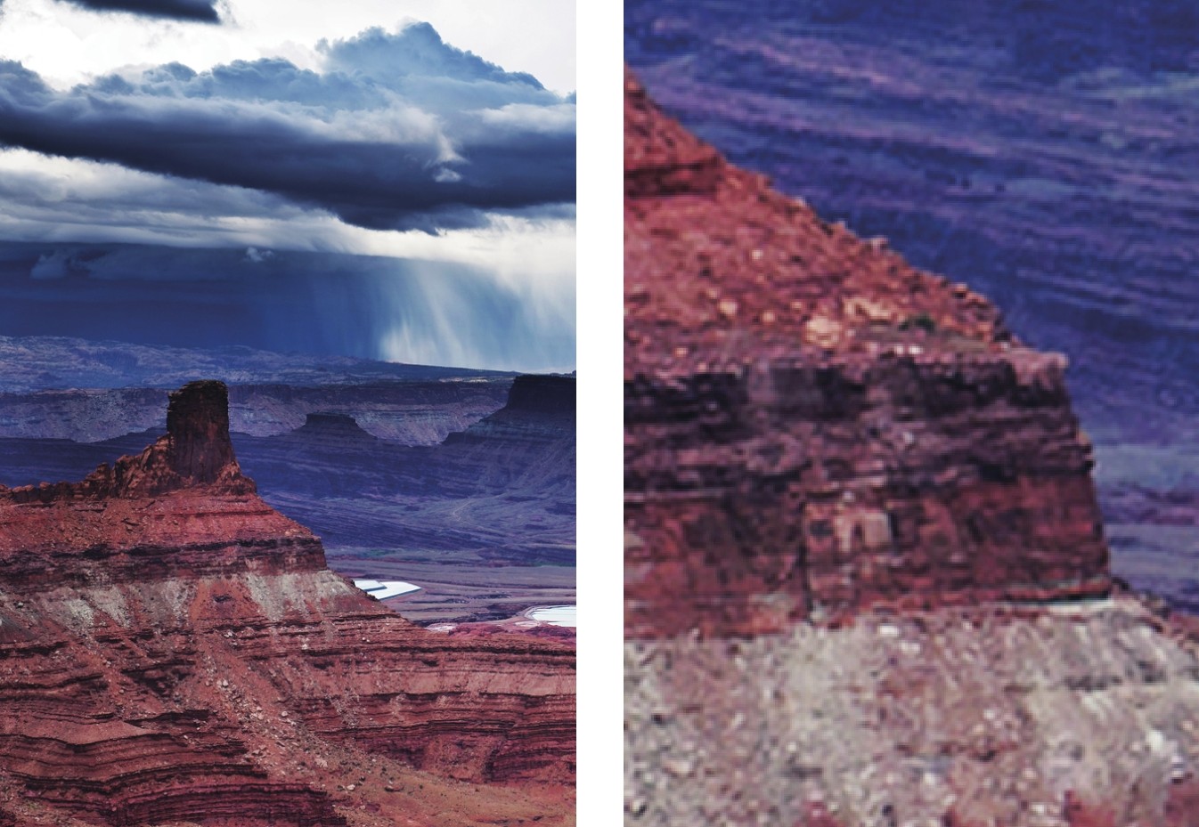 将这两张照片放大至同样大小,左边为550万像素,右边为10万像素,最终可以看到像素较少的图像几乎是没有清晰度和画面质量可言的。