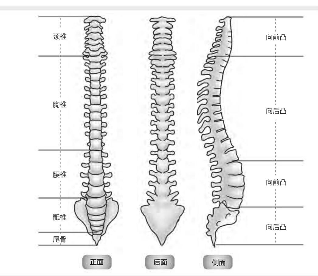 脊柱是人体骨骼结构中最重要的支柱,它上连大脑,下连五脏六腑和四肢,从正面看是笔直的直线,从侧面看则有4个弯曲,有助于减轻行走和跳跃的冲击与震荡。