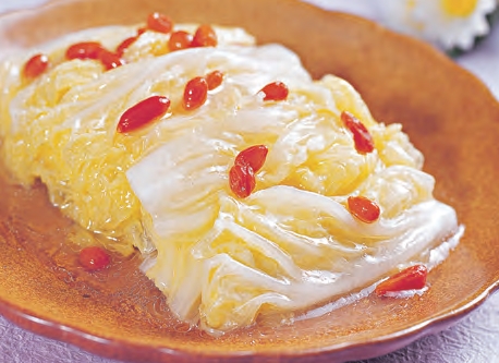 汤中放入枸杞子,加盐、鸡精调味,用淀粉勾芡,浇淋在大白菜上。