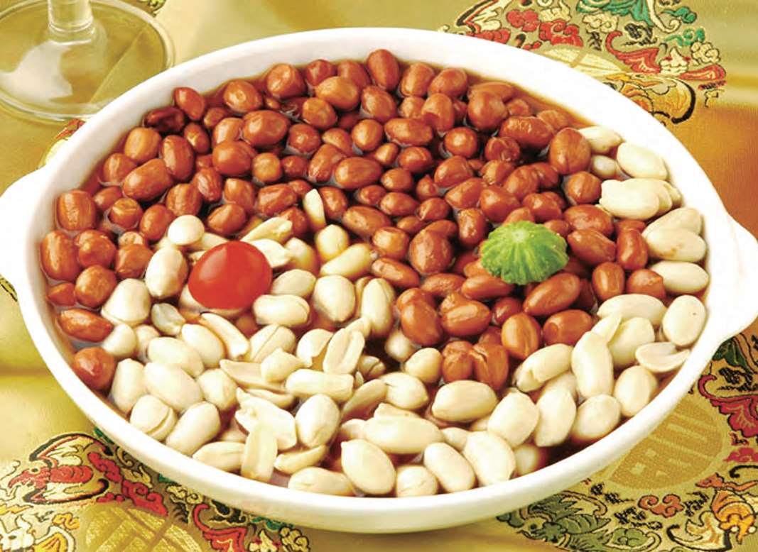 将花生仁洗净。锅中加水后置于火上烧开,先将一部分花生入锅焯熟,捞出过凉水,使其脆嫩,沥干。