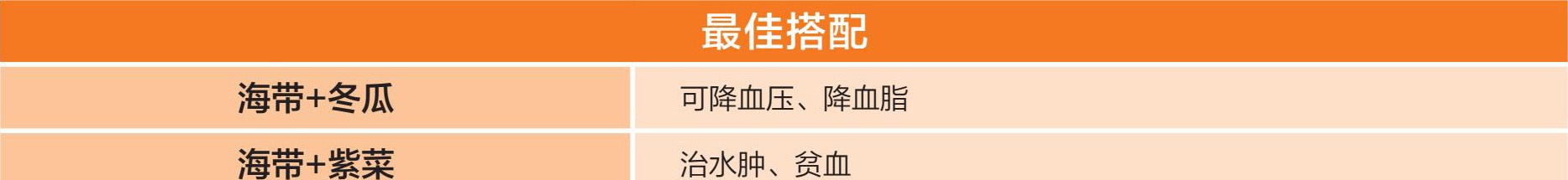 海带的食用方法多种多样,可煮汤、炒食或凉拌。因海带含有褐藻胶物质,不易被煮软,如果把成捆的干海带打开,放在蒸笼里蒸半个小时,再用清水泡上一夜,就会变得脆嫩软烂。由于水质污染,海带中很可能含有毒素——砷,所以烹制前应先用清水浸泡2~3个小时,中间换1~2次水。但浸泡时间不要过长,最多不超过6小时,以免使水溶性的营养物质损失过多。海带性寒,脾胃虚寒、痰多便溏者不宜食用。