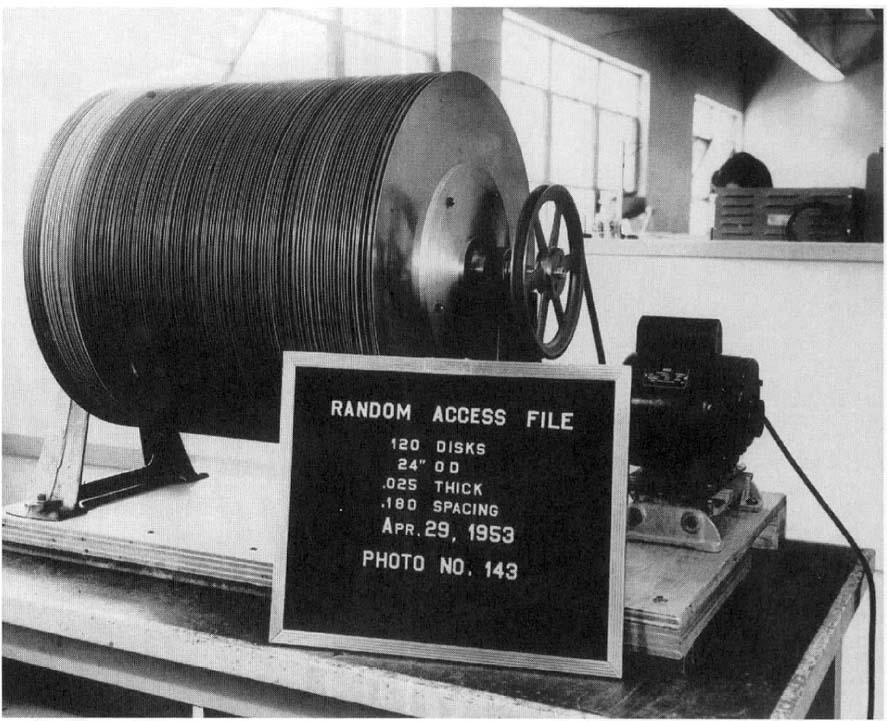 IBM公司圣何塞研究实验室的一个研究团队,在1952年至1956年研制出了世界上第一个硬盘。这个硬盘被命名为RAMAC,其大小相当于一个超大电冰箱,包含50个24英寸的磁盘,能够储存5MB的信息(见图1.2)。决定当今主流硬盘设计的大多数基本构造理念和元件技术,也是由IBM公司成功研发,其中包括可移动磁盘(1961年推出)、软盘(1971年)和温切斯特磁盘(1973年)。所有这些研发成果,对于该行业其他企业的工程师如何定义硬盘及其作用,产生了决定性的影响。