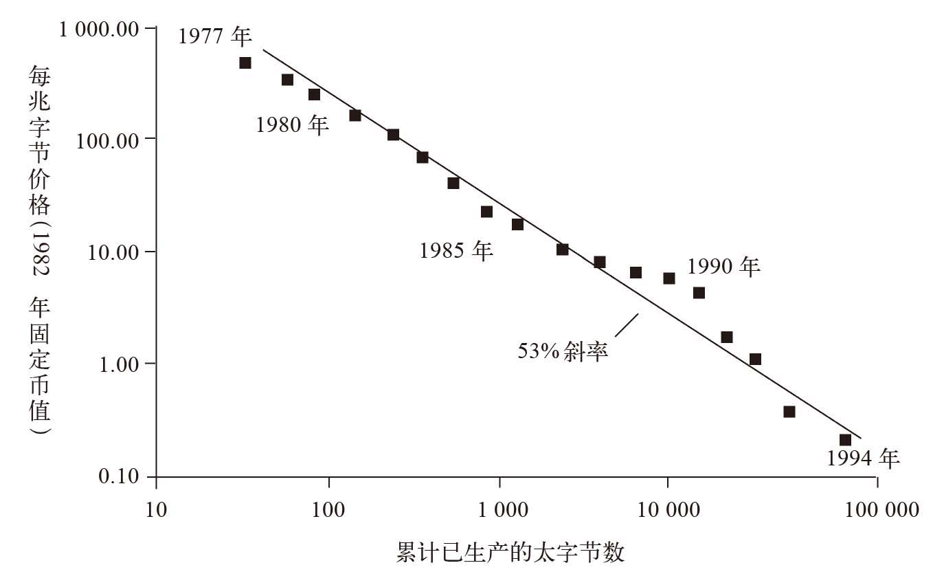 图1.3表明了硬盘行业经验曲线的斜率(将该行业历史上创造的磁盘存储能力的太字节累计数量,与每兆字节存储的币值稳定价格联系起来)为53%,这意味着累计太字节数每增加一倍,每兆字节成本将降至之前水平的53%。这一斜率远远高于市场上其他微电子产品70%的斜率。每兆字节价格的每季度降幅已连续20余年达到约5%的水平。