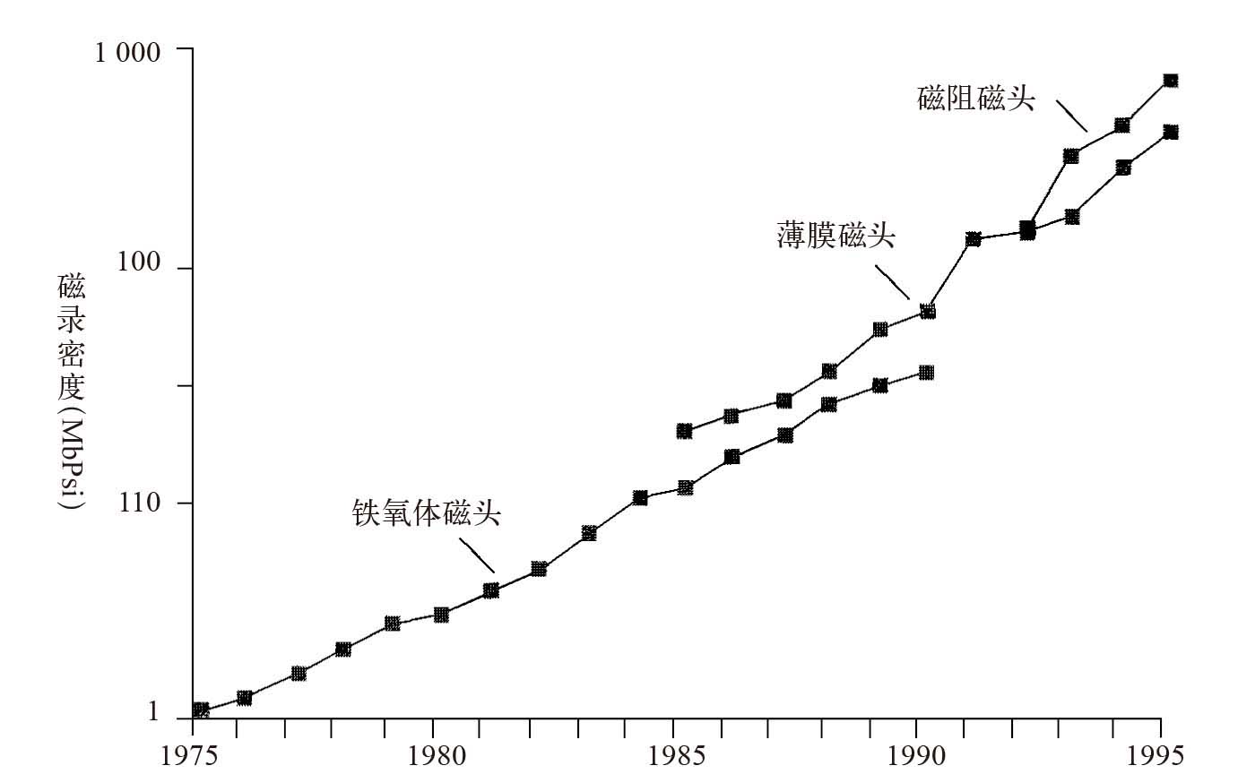 一些分析人士将(创造了这一产业的)这些综合性企业的高淘汰率,归结于硬盘行业日新月异的技术变革速度。的确,变革的速度之快令人咋舌。硬盘工程师能在1平方英寸的磁盘表面写入的信息量,以平均每年35%的速度递增,具体而言,是从1967年的50kb上升至1973年的1.7Mb、1981年的12Mb、1995年的1 100Mb。硬盘的外观大小则以类似的速度在缩小,可生产的最小的20MB的硬盘体积从1978年的800立方英寸缩小到1993年的1.4立方英寸,年递减幅度达35%。