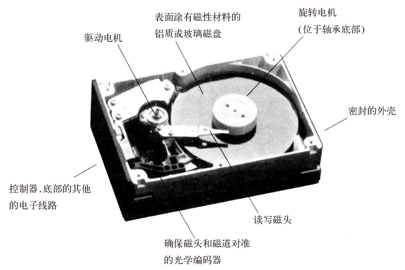 硬盘能够读、写计算机使用的信息。硬盘包括一个读写磁头(读写磁头安装于能在旋转盘表面上来回转动的传动臂底部,其工作原理类似于留声机的唱针和唱臂);其表面涂有磁性材料的铝质或玻璃磁盘;它至少含有两个电机,包括一个驱动磁盘旋转的旋转电机和一个将磁头移动至磁盘上方恰当位置的驱动电机;另有多个控制运行及其与计算机接口的电子电路。有关标准硬盘的结构如图1.1所示。