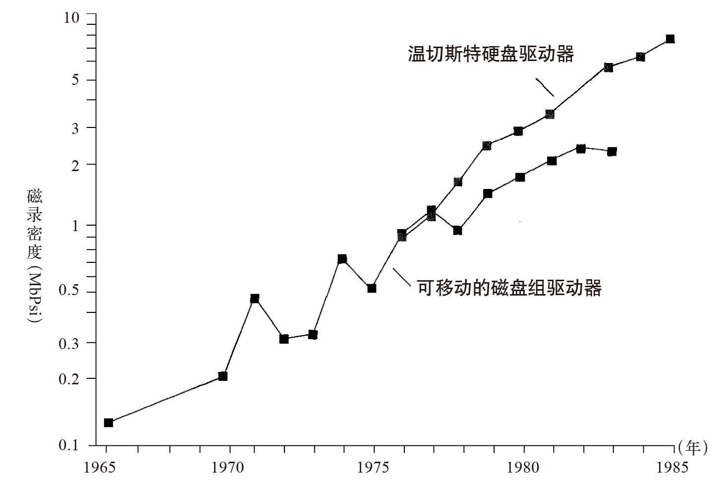 图1.5 温切斯特结构对14英寸硬盘磁录密度的延续性影响