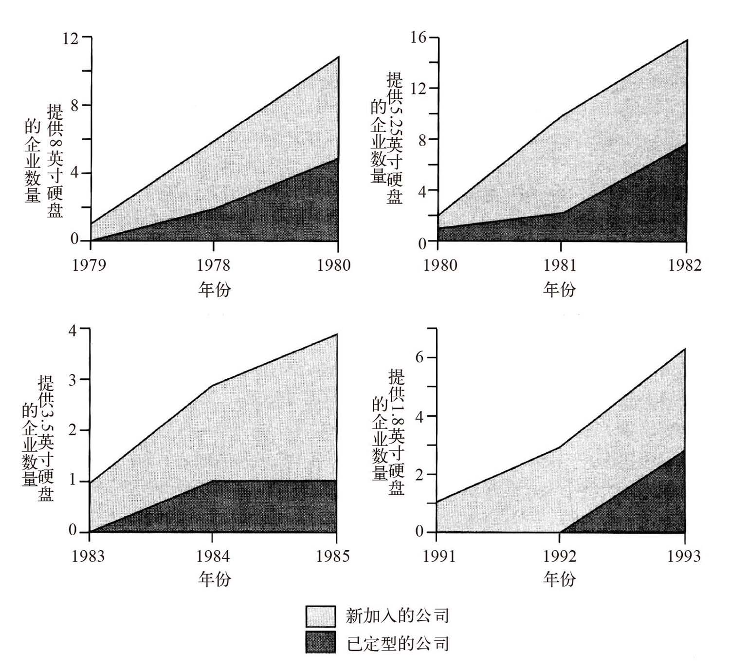 14英寸硬盘制造商并不是由于技术方面的原因而被8英寸硬盘的新兴企业所取代的。8英寸硬盘使用的零部件一般是标准的现成组件,而且当14英寸硬盘制造商终于计划推出8英寸硬盘产品时,这些新兴企业的产品在容量、磁录密度、存取时间和每兆字节价格等方面都具备了很强的竞争力。1981年,成熟企业推出的8英寸硬盘产品,在性能上几乎与新兴企业同年推出的同型号产品一样。此外,成熟企业与新兴企业在关键性能的改进速度(1979年至1983年的调查结果)方面也具有惊人的相似性。