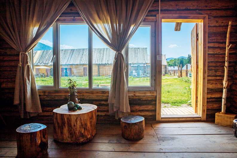 问到“有舍”哪里最能体现主人文化和品位,罗丹告诉我们:“当然是客房,最终和客人零距离接触的就是客房里面的每一个细节。因为房屋主体是哈萨克族的传统木屋,在不改变原有古村落整体风貌的前提下,主体结构和外观没有做改动。室内为了营造出温暖和协调的空间氛围,所有家具都采取就地取材原则,床和置物架是柳木、床头柜是榆木、墙体是红松木、装饰板是白松木、茶台和隔断是杨木、衣架是白桦木、毛巾架是漂流木,窗饰使用亚麻材质,软装布艺汲取了哈萨克族和维吾尔族的纹样元素。”