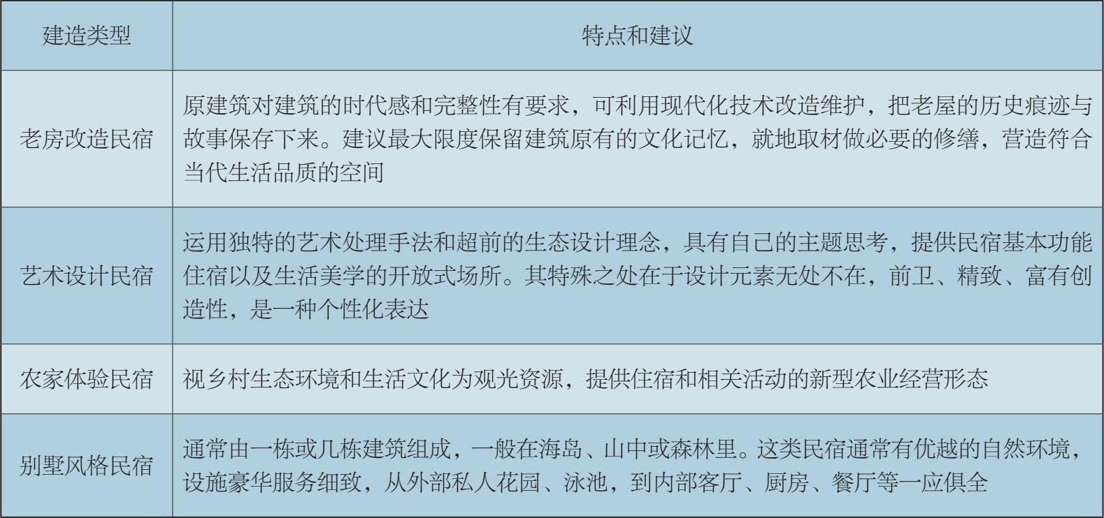 明确民宿建造类型:根据不同民宿建造途径,可分为老房改造民宿、艺术设计民宿、农家体验民宿和别墅风格民宿。新建的民宿应考虑体现当地地域民俗文化,多利用当地材料来丰富建筑造型。