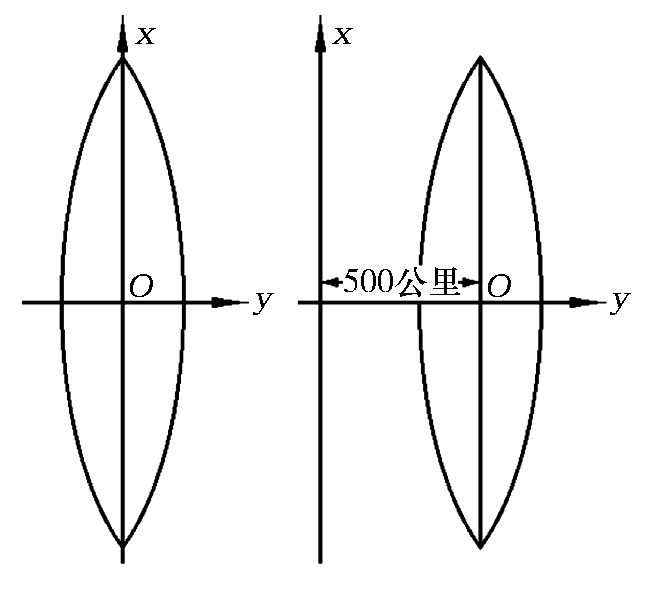 在每个高斯投影带的平面上,中央经度线与赤道形成相互垂直的两条直线,分别作为高斯平面直角坐标系的纵轴( x轴)和横轴(y轴),两轴的交点O作为坐标的原点,同时规定x轴向北为正,y轴向东为正。对于我国的情况而言,领土范围均位于北半球,境内纵坐标x值均为正数,横坐标y值则 有正有负。因此,在实际应用中,为了计算方便,通常将每个投影带的坐标原点向西平移500公里,使整个投影带中任意一点的横坐标 y 都为正值(图1-8)。