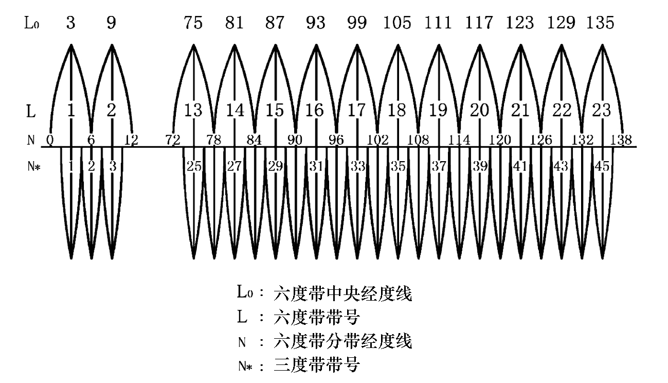 高斯投影又称为高斯—克吕格投影,是一种等角横轴切圆柱投影。高斯投影首先假想用一个圆柱横切于地球椭球体的某一经线上,这条与圆柱面相切的经线,称中央经度线。以中央经度线作为投影的对称轴,将东西每3°或1°30′的两条经度线所夹经差6°或3°的带状地区按数学方法投影到圆柱面上,再展开成平面,即形成高斯投影带(图1-7)。