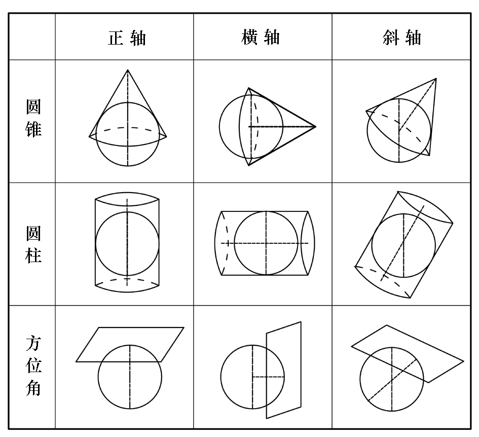 2. 如果按照投影面的形状则可分为“圆锥投影”“圆柱投影”和“方位投影”,它们分别使用圆锥体、圆柱体和平面作为投影面,而按照圆锥、圆柱的轴线以及平面投影的垂线与连接地球南北两极的轴线之间的角度关系,又有“正轴”“横轴”和“斜轴”的差别(图1-3)。