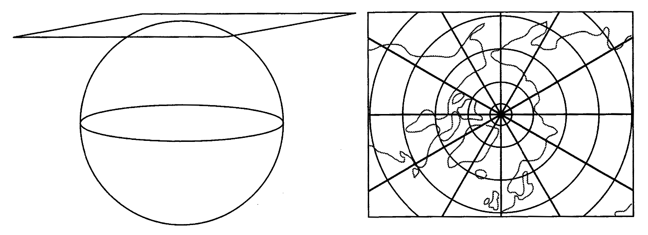 方位角投影(图1-5)采用与地球表面相切于一点的平面为投影面,理论上任意一点都可以作为切点,但实际上只是在表现地球南北两极地区的地图时才使用这种投影,并以南北极为切点。这种投影为等角投影,保持了纬度线圈与从中心点散发的经度线之间的角度关系,因此从中心点出发的角度和距离是相等的,但距离中心点越远,面积变形越大。