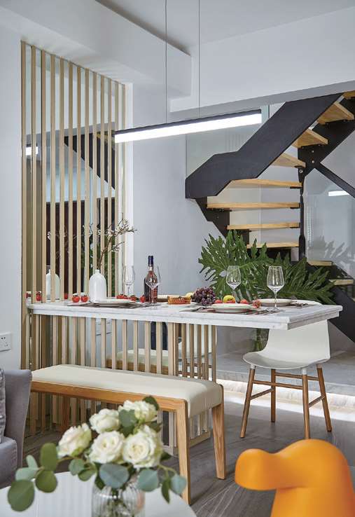 空间看似简约,却极为注重自然的光、植物以及机能的完美结合。极具质感的线条和自然竹木的材质,构成透光的隔断,并呼应了吧台细节。纯天然白色石材巧妙地和竹木隔断结合,为客厅的一隅增加了休闲的体验。采用块面简洁的白色椅子,避免了烦琐的设计。黄色家居单品诙谐幽默,为空间增加了趣味性。