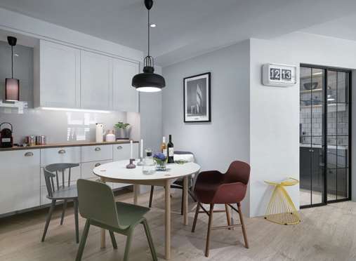 美有千万种的定义,本案的美在于色调的完美衔接。素雅的白色调,烘托出了清新的气氛。原木色的地板与黑色吊灯的搭配手法,令空间的视觉感进退有度。酒红色、亮黄色以及绿豆灰色单椅的撞色,为空间带入了跳跃与活力的情绪。空间以及家具简单的线条造型,都有着去繁从简但又不失大方雅观的气质。