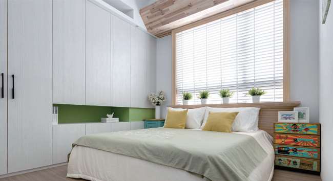 白色的墙面和顶面,配以白色的家具和床品,构成了一个无色的纯净空间。擅用浅色自然系的木纹,能够增加空间的舒适感和温馨感,并能体现北欧风格注重自然的特色。阳光透过白色百叶窗洋洋洒洒地为空间施以温柔。自然原木衬托白色背景,明亮的鲜果绿色搭配柠檬黄色,快乐而丰富。缤纷的漫画图案增加了空间的趣味性,幽默且诙谐。
