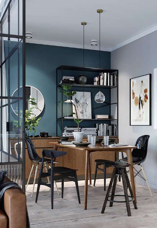 灰色的墙面配以浅色的原木地板,柔和而舒适。孔雀蓝色的墙面搭配棕色的木作家具,加强了空间对比。强烈的对比打破了安静柔和的氛围,并带来了强烈的视觉冲击。采用黑色的铁艺装饰架和黑色的椅子,缓和了空间里的冲突。人物为主题的抽象装饰画、热闹的暖黄色系,为家居环境增加了快乐表情。镜面映衬绿色植物的造景,为空间巧妙地增添了生机。