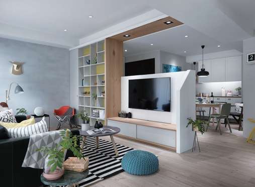 小空间应尽量避免琐碎的分隔,适度的打开,以及保持通透性会更加舒适。将电视背景墙设计成矮墙,不仅有效地将客厅和餐厅区域进行了划分,而且很好地增加了空间的层次感和互动性。
