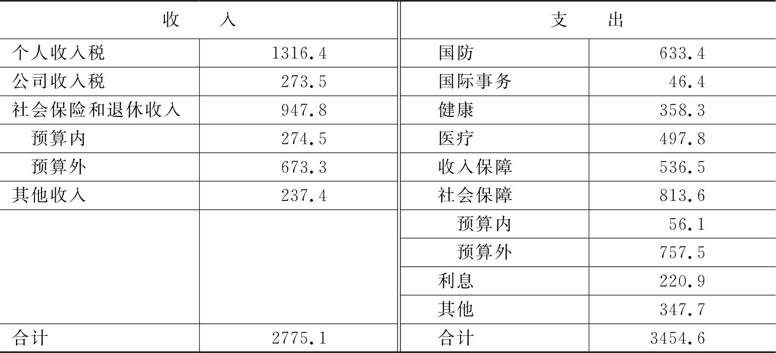 表2-1列出了2013年财政年度美国联邦财政收支表。其中,社会保险和退休收入项既有预算内也有预算外,社会保障支出既有预算内也有预算外。其中,列入预算外管理的主要有老年、遗属和伤残保险。