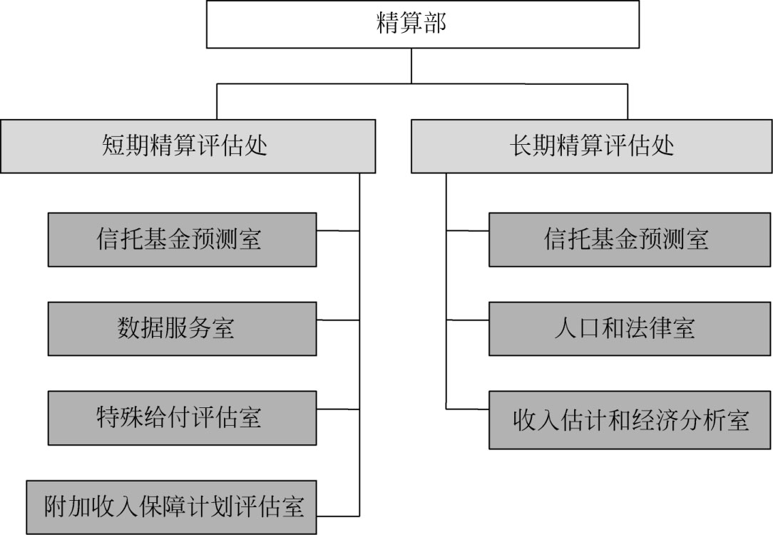 社会保障管理总署的精算部下设短期精算评估处和长期精算评估处两个处。短期精算评估处又有基金预测室、数据服务室、特殊给付评估室、附加收入保障计划评估室四个室。主要负责对社会保障项目在未来10年内的成本做出评估,对信托基金在未来10年内的运作状况做出预测,同时也提供有关数据的收集和统计分析支持。