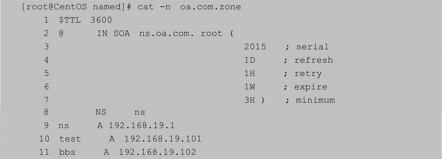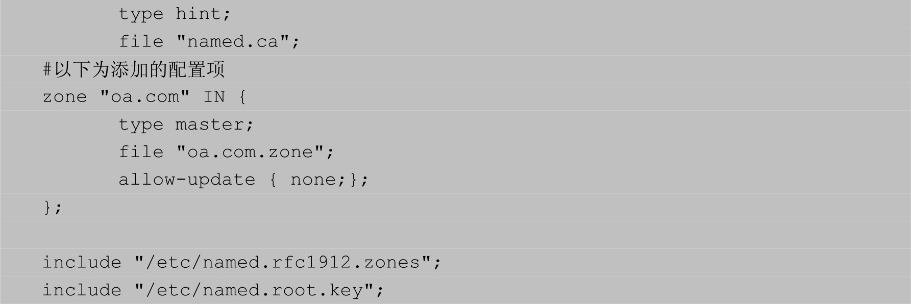 本示例实现的功能是搭建一个域名服务器ns.oa.com,位于192.168.19.101,其他主机可以通过该域名服务器解析已经注册的以“oa.com”结尾的域名。配置文件如【示例3-34】所示,如需添加注释,可以使用以“#”“//”“;”开头的行或使用“/* */”包含。