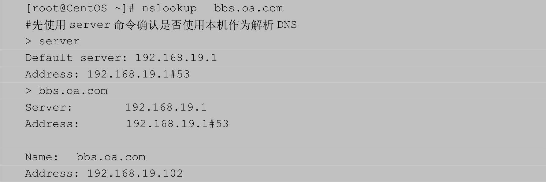 上述示例说明了bbs.oa.com成功解析到192.168.19.102。