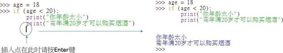 Python使用 缩进方式 区分if语句的程序代码段,编辑程序时可以用 Tab键 缩进或是直接 缩进4个字符空间 ,表示这是if语句的程序代码段。